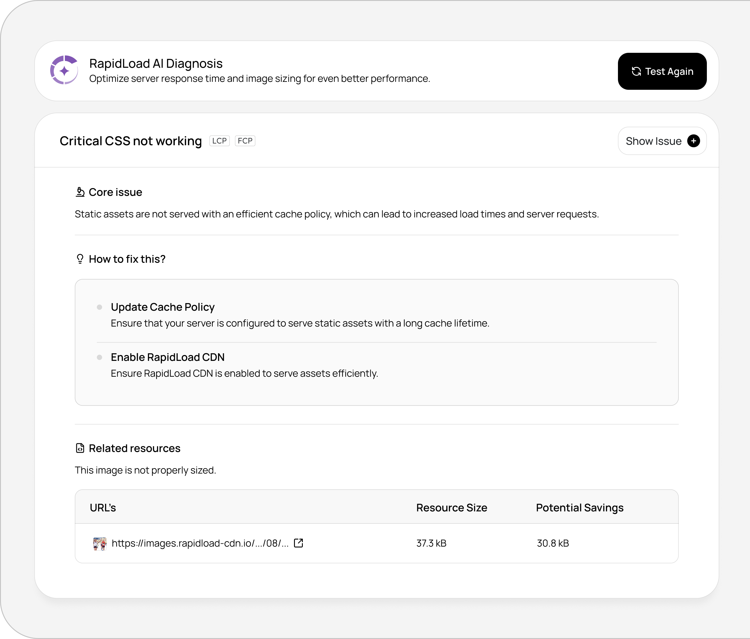 "barely hitting a 30 score and taking forever to load. RapidLoad helped bump it to 75, but I knew there was room for more. Then I found their AI Diagnostics tool. It showed me exactly what was slowing things down and how to fix it. Now we're sitting at 97 and the site loads in a snap. This is the kind of performance I didn't think was possible!"